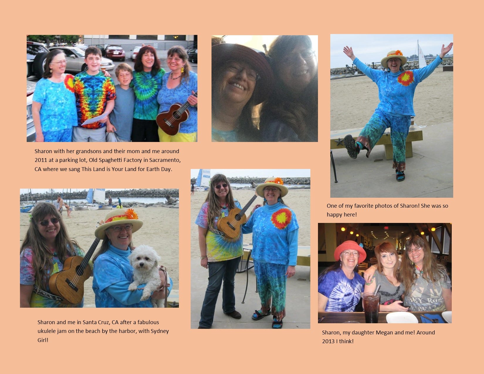 Though we were different in some ways, we were alike in others. We both like to wear tie-dye and be as colorful as possible. We were both musicians and writers, and balanced music and writing. Sharon played the flute and sang beautifully. In 2012, I met Sharon and her grandkids, along with their mom and some of her close friends, at a parking lot at the old spaghetti factory. It was Earth Day, and a video was being made featuring people from all over the world singing “This Land Is Your Land.” We sang it in the parking lot! I play the ukulele.